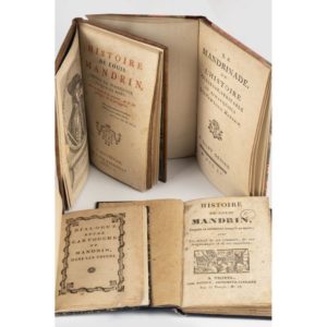 COLPORTAGE. Histoire de Louis Mandrin depuis sa naissance jusqu'à sa mort. Avec un détail de ses cruautés, de ses brigandages et de ses supplices. Troyes, Baudot, s.d. In-12, bradel, cartonnage papier bleu nuit, dos lisse ornée (fin XIXe) 4 gravures. Rousseurs. On joint : - Dialogue entre Cartouche et Mandrin dans les Enfers. Slnd. Un cahier de 16 pp., cartonnage papier marbré moderne, pièce de titre rouge. Rousseurs. - Histoire de Louis Mandrin, depuis sa naissance jusqu'à sa mort. . Avec un détail de ses cruautés, de ses brigandages et de ses supplices. Amsterdam, E. Van Harrevelt, 1755. In-12, veau brun, dos à nerfs, pièce de titre bordeaux (Rel. moderne). Portrait. Rousseurs et mouillures. - LA MANDRINADE ou l'histoire curieuse, véritable et remarquable de la vie de Louis Mandrin. Saint-Geoirs, s. n., 1755. In-12, demi-veau bordeaux, dos lisse (Rel. moderne). Cette biographie à charge contre le célèbre contrebandier devenu une légende de justicier, fut diffusée dès l'année de son exécution. Ex-libris Charles Jaillet, Viennois. Expert : Ségolène Beauchamp