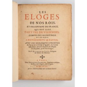 COSTE (F. Hilarion De). Les Éloges de nos rois, et des enfans de France, qui ont este daufins de Viennois comtes de Valentinois et de Diois. A Monseigneur le Dauphin. Avec des remarques curieuses du Pais & de la Noblesse de Daufiné. Paris, Sébastien Cramoisy, 1642. In-8, (16) ff. n. ch., 431 pp., (33) pp., 7 pp. (l'imprimeur au lecteur), veau marbré, double filet doré, dos à nerf orné, pièce de titre rouge, roulette int. dorée (Rel. pastiche moderne). Édition originale : Éloge du Dauphiné, Éloge de Dauphins de France, Les Gouverneurs du Dauphiné, De la Valeur et fidélité de la noblesse de Dauphin. Tables de matières et des armoiries. Rousseurs et taches. Expert : Ségolène Beauchamp
