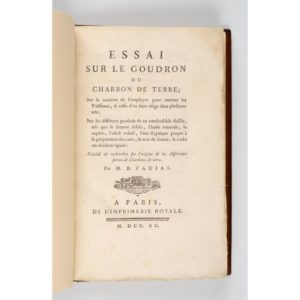 FAUJAS (M. B.). Essai sur le goudron du charbon de terre, sur la manière de l'employé pour caréner les vaisseaux, et celle d'en faire usage dans plusieurs arts… Paris, Imprimerie royale, 1790. In-8, (2) ff. (titre et avert.), 134 pp., veau marbré, dos à nerfs orné, pièce de titre noire (Rel. pastiche moderne). Édition originale rare. Expert : Ségolène Beauchamp