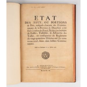 FEUX. État des feux, ou portions de feu ausquels chacune des communautez de la province de Dauphiné a été fixée à raison des fonds nobles, ou exempts de tailles, taillables, & affranchis des tailles, en conséquence du règlement du vingt-quatrième octobre mil six cents trente-neuf, situez dans lesdites communautez. Publié en Parlement le 23 juillet 1706. Grenoble, Alexandre Giroud, 1706. In-4, veau brun, triple filet doré, dos à nerfs orné (Rel. pastiche moderne). Édition originale de cet édit concernant la révision des feux de la province du Dauphiné : élections de Grenoble, Vienne, Romans, Valence, Gap, Montélimart. Ce texte fixa la répartition de la taille jusqu'en 1789. Feuillets lég. gondolés. Expert : Ségolène Beauchamp