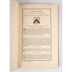 GÉNÉALOGIE. - [HOZIER (Pierre de). Généalogie des familles du Dauphiné. Tome III, registre second]. Slnd (vers 1740). In-folio, demi-veau brun, dos lisse orné, pièce de titre rouge, tranches rouges (Rel. XIXe). Tirage à part de la Généalogie des principales familles de France, contenant les généalogies de 19 familles du Dauphiné, de Allard à Virieu. Avec écussons armoriés et tableaux dépliants. Paginations séparées. Expert : Ségolène Beauchamp