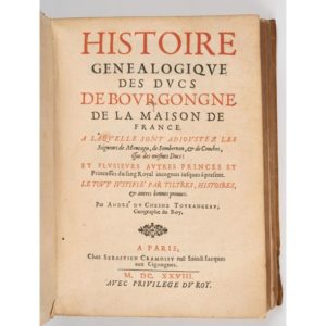 GÉNÉALOGIE. - DU CHESNE (André). Histoire généalogique des ducs de Bourgongne de la maison de France. Paris, Sébastien Cramoisy, 1628. In-4, (6) ff., 168 pp., vélin, titre à la plume au dos (Rel. ép.). Recueil de 6 ouvrages à pagination séparée. À la suite : Preuves de la généalogie des ducs de Bourgogne, de la maison de France. - Preuves de la généalogie des seigneurs de Montagu, de Sombernon, et de Couches. 179 pp. - Histoire des comtes d'Albon, et dauphins de Viennois. 69 pp. - Preuves de la généalogie des dauphins de Viennois. (1) f. bl., 107 pp. - Histoire généalogique des comtes de Valentinois et de Diois, seigneurs de Saint-Valier, de Vadans et de La Ferté, de la maison de Poitiers. - Les Seigneurs de Sainct-Valier et de Clérieu, et marquis de Cotron. 127 pp. - Preuves de la généalogie des comtes de Valentinois, seigneurs de Saint-Valier, d'Arcies, et de Vadans. 115 pp., et (5) pp. de table. Expert : Ségolène Beauchamp
