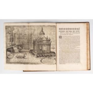 GRENOBLE. Décorations faites dans la ville de Grenoble, capitale de la province de Dauphiné, pour la réception de Monseigneur le duc de Bourgogne et de Monseigneur le duc de Berry. Grenoble, Antoine Frémont, 1701. In-folio, (1) f. de titre, 70 pp., 24 pp., veau moucheté brun, dos à nerfs orné (Rel. de l'époque). Maignien, Imprimerie, 876. Une vignette d'en-tête et 7 planches hors-texte. Un des exemplaires contenant à la suite : Remarques et réflexions sur la pratique des décorations pour les entrées solennelles & réceptions des Princes dans les villes. 24 pp., ornées d'un vignette d'après P. Sevin. Restaurations à la reliure. Quelques rousseurs, mouillures marginales et taches. Expert : Ségolène Beauchamp