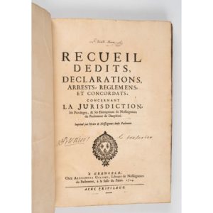 [GUILLET]. Recueil d'édits, déclarations, arrests, règlements, et concordats, concernant la Jurisdiction… du Parlement de Dauphiné. Grenoble, Alexandre Giroud, 1704. In-folio, veau brun marbré, dos à nerfs orné (Rel. ép.). Maignien, Imprimerie, n° 885 : "recueil appelé vulgairement Code Guilliet du nom de son auteur Sébastien Guillet, conseiller au parlement de Grenoble." Ex-libris Gustave Rivet député Dauphinois. Ex-libris manuscrit ancien sur le titre : " Brénier le tresorier". Éraflures et restaurations. Mouillures et rousseurs. Expert : Ségolène Beauchamp
