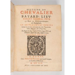 MAILLES (Jacques de). Histoire du chevalier Bayard, lieutenant général pour le roy au gouvernement de Daulphiné, et de plusieurs choses mémorables advenues en France, Italie, Espagne, et és Pays bas... Paris, Abraham Pacard, 1619. In-4, (9) ff., 468 pp., (8) ff. de table, vélin de l'époque, titre à la plume au dos. Seconde édition, publiée par Théodore Godefroy, ornée d'un beau portrait gravé de Bayard. Jacques de Mailles, "loyal serviteur", était le secrétaire de Bayard, le fameux chevalier sans peur et sans reproche ; l'édition originale, rarissime, parut en 1527. Expert : Ségolène Beauchamp