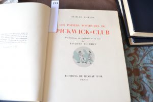 Dickens (Charles) - Les papiers posthumes du pickwick-club. Paris, Editions du rameau d'or, 1937. 3 vol. in4, plein chagrin bleu, couv., conservées, 230, 214, 248 pp., 30 aquarelles hors-texte en couleur de Touchet. Un des ex. sur vélin...