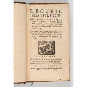 [MATHERON (Charles)]. Recueil historique des merveilles que Dieu a opérées à Notre-Dame du Laus, près Gap en Dauphiné, par l'intercession de la Sainte Vierge. Grenoble, André Faure, 1736. In-12, (23) pp., (1) p. non num., 122 pp., (2) ff. table, (3) ff. cantique ; veau lavallière, triple filet doré, dos à nerf orné, pièce de titre verte, roulette int. dorée (Rel. pastiche moderne). Premier ouvrage imprimé sur l'histoire de Benoîte Rencurel (1647-1718), à qui la Vierge est apparue à partir de 1664, et sur le pèlerinage de Notre-Dame du Laus. Accroc à la coiffe supérieure avec manque. Plusieurs feuillets remontés, petites restaurations, petite déchirure p. 17. Expert : Ségolène Beauchamp