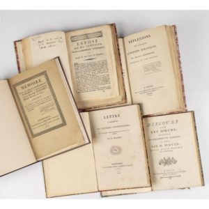 POLITIQUE. - MOUNIER. Exposé de ma conduite dans l'Assemblée Nationale et motifs de mon retour en Dauphiné. Grenoble, Giroud, 1789. 123 pp. - [idem]. Paris, Buisson, 17 novembre 1789. 123 pp. - 2 ouvrages en un vol. in-8, demi-percaline rouge, pièce de titre vert (Rel. ép.). ?Jean-Joseph Mounier, né à Grenoble en 1758 et mort à Paris en 1806, avocat, joua un grand rôle dès les débuts de la Révolution française. Ex-libris Paul Couturier de Royas. On joint : - DUCHESNE. Lettre à messieurs les électeurs constitutionnels du troisième arrondissement électoral de l'Isère. Grenoble, Baratier, 1828. In-8, demi-percaline rouge, dos lisse. Ex-libris Paul Couturier de Royas. - SERVAN. Discours sur les mœurs prononcé au parlement de Grenoble en 1769. Lyon, Joseph-Sulpice Grabit, s. d. In-8, bradel demi-cartonnage papier blanc, dos lisse, piéce de titre rouge, tête dorée (Dupré, H. Vincent succ.). Édition originale, ornée d'un frontispice d'après Eisen. - PROCÈS. - Mémoire pour le Sieur Claude-Ferdinand Tabaret, et pour la dame Julie-Adélaïde Tabaret, femme Achard, sa sœur : contre les auteurs et complices de l'assassinat et du vol commis, le 29 mai 1816, sur la personne de feu le Sieur Claude Tabaret, leur père. Grenoble, C.-P. Baratier, 1818. In-8, bradel cartonnage moderne. Longue notice tapuscrite du collectionneur reliée in fine. - GENOUDE (Eugène). Réflexions sur quelques questions politiques. Paris, Auguste Delalain, 1814. In-8, demi-maroquin rouge, dos lisse orné, pièce de titre noire (Rel. moderne). Édition originale. L'auteur était originaire de la Drôme. Tache au dernier feuillet. Ex-libris manuscrit ancien : Delile, maire de St Martin d'Hères. (M. Jean-Baptiste Bariot Delile fut maire de 1815 à 1826). Expert : Ségolène Beauchamp