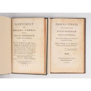 RÉVOLUTION. Procès-verbal de l'Assemblée Générale des Trois-Ordres de la province de Dauphiné, tenue à Romans. Grenoble, J. M. Cuchet, 1788. In-4, 139 pp., demi veau brun, dos lisse orné, pièce de titre rouge. Maignien, Imprimerie, n° 1458, 1461 et 1464. Recueil de 3 procès-verbaux des assemblées des 10 septembre 1788 (139 pp.), 2 novembre 1788 (102 pp.), et 1er décembre 1788 (195 pp.). On joint : - DELLEY D'AGIER. Décret rendu le 4 mai 1790… sur la vente des domaines nationaux. Précédé du rapport fait à l'assemblée nationale. Paris, Imprimerie Nationale, 1790. In-8 demi-percaline rouge, dos lisse, pièce de titre verte. Reliés à la suite 10 pièces (opinions et discours) de Pierre de Delay. Ex-libris Paul Couturier de Royas. - DIALOGUE sur l'établissement et la formation des assemblées provinciales dans la généralité de Grenoble. S. l., s. n., 1787. In-8, bradel, cartonnage moderne, pièce de titre rouge. Ex-libris Jean-Paul Barbier-Mueller. Rousseurs sur le titre. - PROCÈS-VERBAL des derniers États Généraux tenues aux enfers. Où se trouve les plaidoyers de l'évêque de Grenoble et de Judas. S. l., de l'Imprimerie royale des enfers, 1789. - Supplément… Francopolis, s. n., 1789. 2 vol. in-8, bradel, cartonnages modernes. Très rares pamphlets. Ex-libris Jean-Paul Barbier-Mueller. Expert : Ségolène Beauchamp
