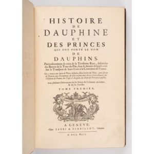 VALBONNAIS (Jean-Pierre Moret de Bourchenu, marquis de). Histoire de Dauphiné et des Princes qui ont porté le nom de Dauphins. Genève, Fabri & Barrillot, 1722. 2 volumes in-folio, I : (4) ff., xii pp., un tableau généalogique et une carte dépliants, une planche, 414 pp. ; II : (1) f. titre, 627 pp., (1) p., 6 planches ; veau brun, roulette à froid sur les plats, dos à nerfs orné, pièce de titre rouge et pièce de tomaison verte, tranches rouges (Rel. ép.). Deuxième édition, largement augmentée. Quelques taches et éraflures, accrocs aux coiffes. Quelques pâles rousseurs. Expert : Ségolène Beauchamp
