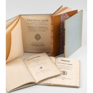 AGRICULTURE. - DUVERNAY (M. L. A.). Traité sur la culture du mûrier et spécialement sur la taille qui convient à cet arbre dans les régions tempérées. Grenoble, Baratier frères et fils, 1843. In-8, 72 pp., bradel cartonnage XIXe, pièce de titre bleu. Quelques rousseurs. Ex-libris Paul Couturier de Royas. On joint : - GUEYMARD (Émile). Sur les magnaneries. Grenoble, Prudhomme et Blanchet, 1843. In-8, 16 pp., bradel cartonnage XIXe, pièce de titre bleue. Extrait du Bulletin de la Société de statistiques du département de l'Isère. 2 planches. Ex-libris Paul Couturier de Royas. - COMMERELL (abbé de). Instruction sur la culture, l'usage, et les avantages de la betterave champêtre. Grenoble, Imprimerie Royale, 1786. In-8, 15 pp., bradel cartonnage XIXe, pièce de titre bleue. Ex-libris Paul Couturier de Royas. - Instruction sur la culture des navets, sur la manière de les conserver, et sur les moyens de les rendre propre à la nourriture des bestiaux. Grenoble, Imprimerie Royale, 1768. In-8, 4 pp., bradel cartonnage XIXe, pièce de titre aubergine. Extrait avec simple titre de départ, en double dans le volume. Ex-libris Paul Couturier de Royas. - CHARREL ( J.). Traité des magnaneries. Paris, Valence, Marc-Aurel, 1848. In-8, demi-veau fauve à coins, dos à nerfs (Rel. fin XIXe). 15 planches. L'auteur était membre des Sociétés d'Agriculture de Grenoble et de Genève. De la bibliothèque Paul Couturier de Royas, avec deux ex-libris. Quelques rousseurs. Expert : Ségolène Beauchamp