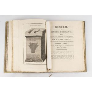 CHALLIEU (M. l'abbé). Mémoires sur diverses antiquités du département de la Drôme et sur les différens peuples qui l'habitaient avant la conquête des Romains. Valence, Marc Aurel, s.d. (1805). In-4, veau brun marbré, dos lisse orné, tête dorée, roulette int. dorée, couv. cons. muette (Rel. pastiche moderne). Édition originale posthume, ornée d'un frontispice gravé représentant l'autel taurobolique de Tain et une planche archéologique. Rare ouvrage "imprimé par souscription des amis des sciences et des pauvres, et par les soins de M. le Maire de Tain". Expert : Ségolène Beauchamp