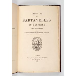 CHASSE, BURLESQUE. - PEIGNOT (G.). Ambassade des Bartavelles du Dauphiné. - Nouvelle ambassade des Bartavelles du Dauphiné. Paris, Aug. Aubry, 1864. 2 opuscules en un vol. In-8, 15 pp., 15 pp., bradel demi-maroquin rouge, dos lisse (Rel. moderne). Rares extraits du Bulletin du bouquiniste, n°169-170, et 166, chacun tiré à 25 exemplaires seulement. Curieux poème, composé en 1810 par un professeur de Vesoul, "pour féliciter Monsieur Hilaire préfet de la Haute-Saône sur le titre de baron et sur la dotation qu'il vient de recevoir de Sa Majesté Napoléon 1er". Dans cette pièce en vers, les jeunes ambassadrices sont arrivées à Vesoul dans un pâté, elles sont comparées aux bartavelles de l'Isère. Expert : Ségolène Beauchamp
