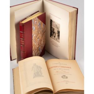 CORPORATIONS. - ROUX (Xavier). Les Papetiers du Dauphiné avant et après la Révolution. Grenoble, imprimerie Vallier et Chabert, 1887. In-8, (2) ff., xii pp., 144-7-16-14 pp. -1 f. blanc - 47 pp., (2) ff., demi-maroquin rouge à coins, dos à nerfs orné, tête dorée, couv. en peau de vélin et dos cons. (J.-E. Baudrillart). Édition originale. Les études sur les papeteries dauphinoises sont tirées sur les différents papiers de ces fabriques et ont une pagination séparée. Envoi a. s. de l'auteur. On joint : - ROUX (Xavier). La Corporation des gantiers de Grenoble avant et après la Révolution. Grenoble, Gabriel Dupont, 1887. In-8, bradel demi-toile brune à coins moderne, pièce de titre noir, couv. cons. Édition originale, tirée à 425 exemplaires dont 25 sur papier hollande. - FIGUET. - Album factice sur la manufacture Figuet, fabricant de chaussures à Romans, 1909. In-4, demi-chagrin rouge moderne. Album unique composé par Daniel Lambert en 2003. Expert : Ségolène Beauchamp