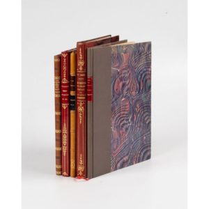 DIVERS. - DOCHIER. Essai historique sur le monastère et le chapitre Saint-Barnard de la ville de Romans. Valence, Marc Aurel, 1818. In-8, demi-veau fauve, dos lisse orné, tête dorée, couv. muette cons. (Rel. moderne). On joint : - MERMET aîné. Rapport sur les monuments remarquables de l'arrondissement de Vienne. Vienne, Timon, 1829. In-8, demi-percaline brune, couv. cons. (Rel. de la fin du XIXe). De la bibliothèque Paul Couturier de Royas (1853-1954), avec son ex-libris et un ex-dono sur la couverture : "Pour Couturier de Royas". - MARTIN (Jean-Claude). Antiquités et inscriptions des villes de Die, d'Orange, de Vaison, d'Apt et de Carpentras. Nouvelle édition. Orange, Joseph Bouchony, 1818. In-8, demi-veau rouge avec coins, dos lisse orné, tête dorée (Rel. moderne). - PIERQUIN DE GEMBLOUX. Lettres à M. Matter, sur les antiquités de Grenoble. Grenoble, Baratier, 1836 - Lettre à M. Gautier sur les antiquités de Gap. Grenoble, Barnel, 1837. 2 ouvrages en un vol. in-8, demi-maroquin moutarde à coins, dos à nerfs, couv. cons. (Rel. de la fin du XIXe). Ex-libris armorié Bibliothèque de Mr Roman. - DASSY (L.-T.). Le Trésor de l'église abbatiale de Saint-Antoine en Dauphiné ou La vérité sur les reliques du patriarche des cénobites. Marseille, La Ferrière, 1855. In-8, demi-maroquin rouge, dos lisse orné en long (Rel. ép.). 2 planches en frontispice. Ens. 5 vol. Expert : Ségolène Beauchamp