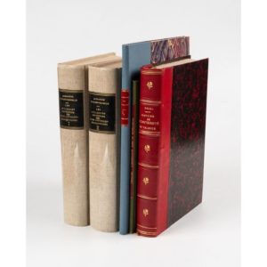 DIVERS. - FAUCHÉ-PRUNELLE (Alexandre). Essai sur les anciennes institutions autonomes ou populaires des Alpes Cottiennes-Briançonnaises. Grenoble, Vellot et comp, Paris, Dumoulin, 1856-1857. 2 volumes. In-8, bradel toile moderne grise, pièce de titre noire, couv. cons. On joint : - NADAL (l'abbé). Histoire de l'université de Valence. Valence, E. Marc Aurel, 1861. In-8, demi-maroquin rouge, dos à nerfs orné, couv. cons. (Rel. moderne). Gravure frontispice et plan de Valence dépliant. - CHABRAND (Dr). État de l'instruction primaire dans le Briançonnais, avant 1790. Grenoble, Xavier Drevet, (1882). In-8, bradel, demi-percaline verte, pièce de titre rouge, couv. cons. Ex-libris Paul Couturier de Royas. Rousseurs. - PRUDHOMME (A. ). L'enseignement secondaire à Grenoble avant la création du collège des dominicains (1340-1606). Grenoble, Allier frères, 1901. In-8, demi-percaline bleu, dos avec pièce de titre rouge, couv. cons. (Rel. ép.). Envoi a. s. de l'auteur à Paul Couturier de Royas, avec son ex-libris. Expert : Ségolène Beauchamp