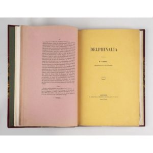 GARIEL (Hyacinthe). Delphinalia. Grenoble, N. Maisonville, 1852-1856. In-8, demi-maroquin bordeaux à coins, dos à nerfs, tête dorée, couv. muette cons. (Rel. moderne). Recueil factice réunissant les 5 brochures de Hyacinthe Gariel concernant l'ancienne province de Dauphiné. Janvier 1852 : tirage à 120 ex. ; 2 ex. parmi les 8 de tête sur papier couleur (rose et jaune). Mai 1852 : tirage à 120 ex. ; un des 8 de tête sur papier couleur (jaune). Avril 1854 : tirage à 90 ex. ; un des 20 sur hollande. Octobre 1855 : tirage à 120 ex. ; un des 72 ordinaires, de la Bibliothèque Eugène Chaper, avec son ex-libris. Septembre 1856 : tirage à 100 ex. ; un des 20 sur hollande. Expert : Ségolène Beauchamp