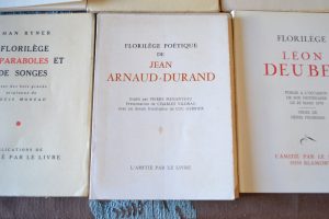 frontispice de J. M. Granier (signé au crayon) 94 pp. Un des des 50 sur Lafuma signé par l'auteur 3 - Jacques (Lucien) - Florilège poétique L'amitié par le livre 1962. in12 broché 78 pp. Bois gravés de l'auteur un des ex. sur Alfa Mousse signé par l'auteur 4 - Fourcade ( Claude) Florilège poétique L'amitié par le livre s.d. in12 broché 83 pp ill. Par Dionisi 5 - Deubelle (Leon) Florilège poétique L'amitié par le livre 1979. in12 broché 80 pp 6 - Bulliard (Paul) -Florilège poétique - L'amitié par le livre 1943. in12 broché 55 pp Bois gravés originaux de Gérard Cochet 7 - Ryner (Han) Florilège de paraboles et de songes L'amitié par le Livre, sd. (1942). In12 broché, bois gravés de Louis Moreau 74 pp. Bel ensemble.