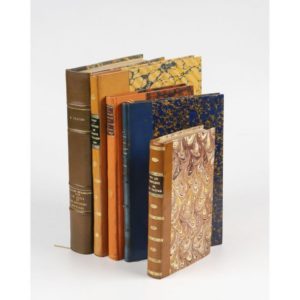 GÉOLOGIE. - PAQUIER (V). Recherches géologiques dans le Diois et les baronnies orientales. Grenoble, Allier frères, 1900. In-4, demi-maroquin vert, dos à nerfs, non rogné, couv. cons., abîmées (Rel. ép.). Cartes et planches. Dos passé. On joint : - DERYAUX (Antoine). Découverte de la vraie cause de la précession des équinoxes ainsi que de la rétrogradation des nœuds de la lune contre l'ordre des signes du Zodiaque. Vienne, Timon frère, 15 septembre 1850. In-8, demi-veau bleu, dos à nerfs, tête dorée. "Cette importante découverte, qui a déchiré le voile dans lequel était enveloppée la science astronomique, est appelée à donner la solution des nombreux phénomènes qui, jusqu'à présent, n'avaient été que très imparfaitement compris." Dos foncé. - GUEYMARD (Émile). Sur la minéralogie, la géologie et la métallurgie du département de l'Isère. Grenoble, Baratier frères et fils, 1831. In-8, bradel, demi-percaline orange, dos lisse orné, pièce de titre brune (Rel. XIXe s.). Édition originale de cette statistique publiée aux frais du département. Une carte dépliante. Rousseurs. - ROCHAS (Jacques François Joseph de). Nouveau pas sur les sentiers de la nature concernant les causes physiques des secousses réitérées des tremblements de terre. Système sur la matérialité de l'axe du globe terrestre. Gap, J.-B. Genou, 15 mai et 28 juin 1808. In-12, demi-veau fauve, dos lisse orné, pièce de titre marron, tête dorée (Rel. moderne). Deuxième édition, augmentée, publiée le 25 juin 1808 (l'édition originale avait paru le 15 mai). Mouillure. - VICAT (L. J.). Résumé des connaissances positives actuelles sur les qualités, le choix et la convenance réciproque des matériaux propres à la fabrication des mortiers et des ciments calcaires. Paris, Firmin Didot, 1828. In-4, demi-veau moutarde, dos lisse orné, pièce de titre noire (Rel. moderne). Mouillures. Cachet. Expert : Ségolène Beauchamp