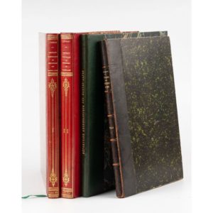 HAUTES-ALPES. - ROMAN (J.). Tableau historique du département des Hautes-Alpes. Paris, Alphonse Picard ; Grenoble, Allier, 1887- 1890. 2 volumes in-4, demi maroquin rouge, dos lisse orné (Rel. ép.). Étude divisée en deux parties : État ecclésiastique, administratif et féodal antérieur à 1789 ; inventaire et analyse des documents du Moyen-Âge relatifs au haut Dauphiné 561-1500. Tirage à 250 exemplaires. On joint : - ROMAN (J.). Répertoire archéologique du département des Hautes-Alpes. Paris, Imprimerie nationale, 1888. In-4, demi-maroquin vert, dos lisse, tête dorée, couv. cons. (Reliure moderne). - [LADOUCETTE. Histoire des Hautes-Alpes. Atlas seul. 1834 ?]. In-8, demi-chagrin noir de l'époque. 26 planches dont une carte dépliante. Ex-libris Jouffray. Expert : Ségolène Beauchamp