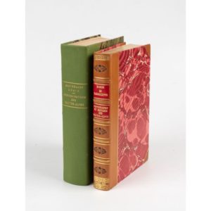 LADOUCETTE (Baron de). Histoire, antiquités, usages, dialectes des Hautes-Alpes. Paris, Hérissant le Doux, 1820. In-8, demi-veau fauve à coins, dos à nerfs orné, pièces de titre rouges, tête dorée (D. Saporito). Édition originale illustrée d'une carte dépliante et 7 planches hors-texte. Le Baron de Ladoucette fut préfet des Hautes-Alpes de 1802 à 1809. Il fut le fondateur de la Société d'émulation des Hautes-Alpes et du musée de Gap. On joint : CHAIX (B.) Préoccupations statistiques, géographiques, pittoresques et synoptiques du département des Hautes-Alpes. Grenoble, F. Allier, 1845. In-8, demi-maroquin vert, dos lisse (Rel. moderne). Ex-libris Paul Helbronner. Rousseurs. Expert : Ségolène Beauchamp