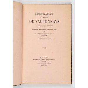 OLLIVIER (Jules). Correspondance littéraire de Valbonnays, Premier président de la Chambre des comptes de Dauphiné. Valence, L. Borel ; Paris, Crozet, 1839. In-8, demi-maroquin vert, dos à nerfs orné, tête dorée, non rogné (Rel. ép.). Édition originale. Exemplaire en grand papier vélin rose. De la bibliothèque Paul Couturier de Royas (1853-1954), avec deux ex-libris. Pâles rousseurs. Expert : Ségolène Beauchamp