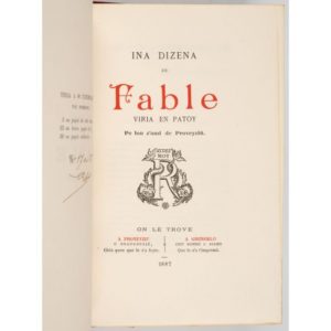 RAVANAT (Albert). Ina dizena de fable viria en patoy Pe lou z'ami de Proveyziû. Proveyzieux, Grenoble, J. Allier, 1887. In-8, bradel demi-maroquin rouge à coins, couv. cons. sans le dos (Stroobants).Joli et rare recueil de 10 fables de La Fontaine, précédées d'une Fable de Louis Blanc, traduites en patois de la région de Grenoble. Ex-dono sur une garde : "Offert à Monsieur Jourdan, de la part de la sœur de l'auteur, Odile Ravanat". Tirage à 80 exemplaires, un des 25 sur vergé. Pâles rousseurs sur les couvertures. Expert : Ségolène Beauchamp
