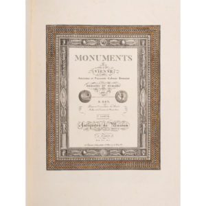 REY (E.). Monuments romains et gothiques de Vienne en France. Suivis d'un texte historique et analytique par E. Vietty. Paris, Firmin Didot, 1820 - 1831. 2 tomes en un volume in-plano, I : (3) ff., 84 pp., II : titre, 2 pp., 72 planches, 1 f. de table, 1 f. de liste des souscripteurs, demi-chagrin bordeaux à coins, dos à nerfs orné or, noir et à froid (Rel. moderne). Imposante publication qui s'étala sur plus de dix ans. Exemplaire imprimé sur vélin fort contenant le texte explicatif et la description des planches, suivi du recueil avec plan frontispice de Vienne (num. pl. XVII), un titre frontispice en couleurs, 23 planches numérotées de détails archéologiques, un f. titre manuscrit pour la deuxième partie intitulée "monuments romains", un deuxième exemplaire du plan frontispice de Vienne, 28 planches lithographiées de vues et d'architectures (coupes et élévations) ; un f. de titre manuscrit pour la troisième partie intitulée "monuments gothique", 19 planches lithographiées de vues et d'architectures. Rousseurs et petites mouillures. Accroc dans la marge sup. de certains feuillets. Expert : Ségolène Beauchamp