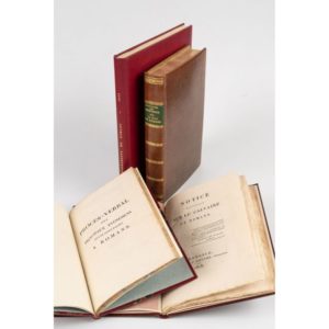 ROMANS. - DOCHIER. Mémoires sur la ville de Romans. Suivie de l'éloge du chevalier Bayard. Valence, Imprimerie de Jacques Montal, 1812. In-8, veau brun moucheté, dos lisse orné, pièce de titre verte, tête dorée, roulette int. dorée (Rel. moderne). Édition originale. Cachet sur le titre. Rousseurs. On joint : - LAMBERT. Procès-verbaux des principaux événemens qui se sont passés à Romans, depuis le 26 mars jusqu'au 24 avril 1814. Valence, Marc Aurel, 1814. In-8, demi-maroquin rouge à coins, dos à nerfs (J.-E. Baudrillart). Relié à la suite, du même auteur : Dialogue entre deux romanais et la nymphe de l'Isère, récité devant SAR Monsieur, à son passage à Romans, le 17 octobre 1814. Valence, Marc Aurel, novembre 1814. - Notice historique sur le calvaire de Romans. Grenoble, C.-P. Baratier, 1818. In-8, bradel cartonnage papier moderne, couv. muette cons. - [Recueil factice. Événements qui se sont déroulés à Romans en mars et avril 1814. Miscellanées]. In-8, maroquin janséniste rouge, dos lisse (Rel. mod.). DOCHIER. Récit de ce qui s'est passé dans la ville de Romans, depuis l'entrée jusqu'au départ des Autrichiens, du département de la Drôme. Valence, Marc Aurel, 1814. - Précis des événements qui se sont passés à Romans... Valence, Marc Aurel, novembre 1814. - DOCHIER. Précis de ce qui s'est passé dans la ville de Romans, au passage de SAR Monsieur, frère du roi, Louis XVII, contenant une notice historique sur les vins d'honneur. Valence, Marc Aurel, novembre 1814. - MANUSCRIT. [Chronique des événements qui se sont déroulés à Romans en mars et avril 1814]. 5 ff. et 1 f. blanc. Expert : Ségolène Beauchamp