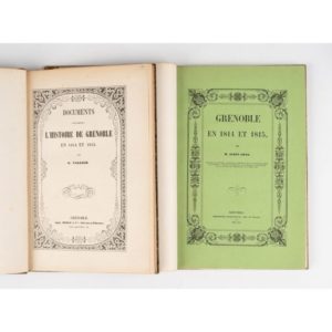 VALLIER (Gustave). Documents pour servir à l'histoire de Grenoble en 1814 et 1815. Grenoble, Alph. Merle & cie, s.d. (1860). In-8, demi- veau havane, dos à nerfs orné, pièce de titre noire, tête dorée, couv. cons. (Rel. ép.). Une planche dépliante. Dos frotté. On joint : GRAS (Albin). Grenoble en 1814 et 1815. Grenoble, Maisonville, mai 1854. In-8, demi-veau fauve, dos à nerfs orné, pièce de titre verte, tête dorée, couv. cons. sans le dos (Rel. ép.). Charnières frottées, accroc à la coiffe sup. Ces 2 volumes proviennent de la Bibliothèque Eugène Chaper, avec ex-libris. Expert : Ségolène Beauchamp