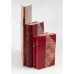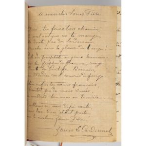 RICHARD (Pierre). Le Poète Zénon-Fière et ses poèmes posthumes à Saint François d'Assise. Valence-sur-Rhône, Galerie drômoise, 1926. In-12, demi-maroquin bordeaux à coins, dos à nerfs, tête dorée, couv. et dos cons. (J. E. Baudrillart). Édition originale, tirée à 506 exemplaires. Un des 50 sur hollande, le n° 1, imprimé spécialement "pour madame H. Gaume, née Zénon-Fière", avec envoi a. s. de l'auteur. Exemplaire enrichi de l'acte original de profession du frère Jean de Parme, Émile-Casimir Zénon-Fière (1898), d'un poème a s. de Louis Le Cardonnel "à mon cher Louis Fière", une lettre de J. Colomb (1933), et d'un long poème a. s. daté 1882 de Zénon-Fière. On joint : - LE CARDONNEL (Louis). Carmina Sacra. Paris, Mercure de France, 1912. In-12, demi-maroquin bordeaux à coins, dos à nerfs, tête dorée, couv. et dos cons. (Rel. moderne). Édition originale, tirée à 49 exemplaires. Un des 9 de tête sur japon impérial. - LE CARDONNEL (Louis). Du Rhône à l'Arno. Paris, La connaissance, 1920. In-folio, veau fauve marbré, dos à nerf, pièce de titre brune, roulette int. dorée. Avec 2 ff. autographes signés de Le Cardonnel collés au début du volume (poèmes). Ex-libris Dayral. - RICHARD (Noël). Louis Le Cardonnel. Paris, Marcel Didier ; Toulouse, Privat, 1946. In-12, demi-maroquin bordeaux à coins, dos à nerfs, tête dorée, couv. et dos cons. (J.-E. Baudrillart). Annotation a. s. de l'auteur sur le faux-titre. Avec, monté sur onglet, un sonnet autographe signé de Louis Le Cardonnel (froissé), intitulé "Mélancolie". Ex. également truffé de quelques photos et documents, dont une caricature originale au crayon signée L. Ageron. Expert : Ségolène Beauchamp