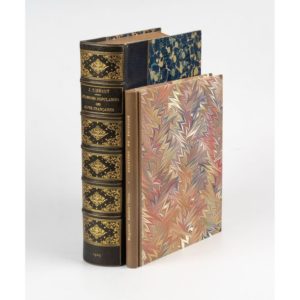 TIERSOT (Julien). Chansons populaires recueillies dans les Alpes françaises (Savoie et Dauphiné). Grenoble, H. Falque et F. Perrin , Moutiers, François Duclos, 1903. Fort in-folio, demi-maroquin bleu, dos à nerfs orné, tête dorée, couv. cons. (Rel. ép.). Illustrations in-texte. Tirage à 1350 exemplaires, celui-ci bien relié. On joint : GAUTHIER-VILLARS (Marguerite). Chansons populaires recueillies au Villard-de-Lans. Paris, éditions Roudanez, 1929. In-8, bradel, demi-maroquin taupe, cartonnage moderne, couv. cons. Envoi a. s. de l'auteur, daté 1931 : " au maître incomparable des variantes sur Au clair… et autres chansons…" Expert : Ségolène Beauchamp