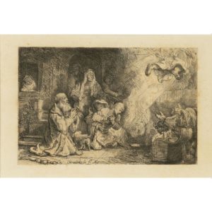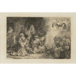 REMBRANDT VAN RIJN (1606-1669) L'ange prenant congé de la famille de Tobie Eau-forte Epreuve en tirage tardif rognée de quelques millimètres, avant la marque du cuivre, un peu jaunie, collée Etching, late print trimmed just within the platemark, slightly yellowed, glued 10,1 x 15,2 cm - 3,98 x 5,99 in. Expert : Sylvie Collignon Bibliographie : K.G.Boon 43 ; New Hollstein 189 VIII/IX