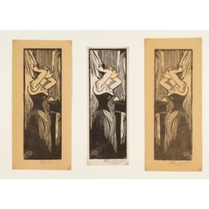 Eugène DELATRE (1864-1938) La Toilette Trois gravures sur bois l'une en couleurs sur vélin, les autres sur Chine ou papier chamois Epreuves signées Three woodcuts, one in colors on wove paper, the others on China and Chamois paper. All signed sujets : 31 x 10,5cm. Feuillets le plus petit : 33 x 11,5cm; le plus grand : 37 x 16cm - Images : 12,20 x 4,17in. ; smallest sheet : 12,99 x 4,52in. ; largest sheet : 14,56 x 4,56 in. Expert : Sylvie Collignon