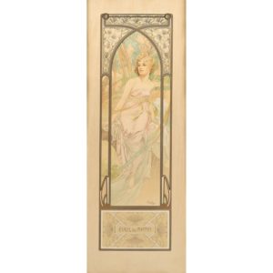 ALPHONSE MUCHA (1860-1939) Repos de la nuit - Eveil du matin - Rêverie du soir - Eclat du jour Quatre lithographies en couleurs Variante en petit format de la série " Les Heures du jour " Découpées au sujet et collées Quelques taches, jaunies sur les bords (Version réduite de la série reproduite dans Rennert et Weill, n° 62) Four lithographs in colors. Reduced version of "Les Heures du Jour". Few stains, yellowed on edges 59,1 x 18cm - 23,27 x 7,09 in. Expert : Sylvie Collignon
