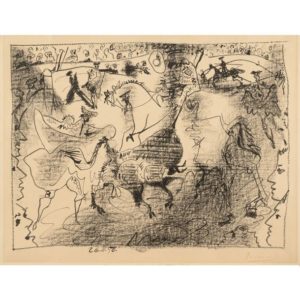 Pablo PICASSO (1881-1973) La Pique, 26-11-50 Lithographie sur vélin d'Arches crème Signée au crayon de couleur rouge et numérotée 3/50 Légèrement jaunie avec trace de passe-partout sur les marges Lithograph on Arches cream laid paper. Signed in red coloured pencil and numbered 3/50. Slightly yellowed, marks on margins, traces of old matt Sujet : 45,5 x 59cm. Feuillet : 50 x 66 cm - Image : 17,92 x 23,23 in. Sheet : 19,69 x 25,99 in. Expert : Sylvie Collignon Bibliographie : Bloch 683, Mourlot 196