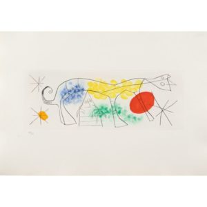JOAN MIRO (1893-1983) ILLUSTRATION POUR POÈMES ET CHANSONS - ERIK SATIE, 1969 Eau-forte en couleurs sur vélin au filigrane L.B. Numérotée 45/75 Quelques plis ondulés Etching in colors on wove paper with watermark L.B, numbered 45/75. A few wavy folds Sujet : 13,5 x 35,5 cm ; Feuillet : 38 x 54 cm - Image : 5,32 x 13,98 in ; Sheet : 15,97 x 21,26 in. Expert : Sylvie Collignon Bibliographie : Dupin 522