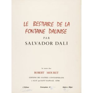 Salvador DALI (1904-1989) Le bestiaire de la Fontaine Dalinisé Titre, table et 12 estampes à l'eau-forte, pointe sèche et pochoir sur papier Auvergne blanc ou crème Chacune signée et numérotée III/CXX Dans un emboitage recouvert de velours beige, titre doré Edité par Robert Mouret, éditions des Maitres Contemporains, Agay 1974 Avec les certificats d'authenticité Légères traces de plis et petites taches Etching, dry point and stencil on white or cream Auvergne paper. Title, table and 12 prints, each signed and numbered III/CXX. In a velvet case with golden title. Light fold marks and little stains Feuillets : 77 x 58 cm - Sheet: 30,3 x 22,8 in. Expert : Sylvie Collignon BIBLIOGRAPHIE : Michler et Löpsinger 653 - 664