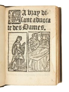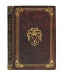[Laurens BELIN ou Jean MAROT]. La Vray disant advocate des Dames. Plaquette petit in-8, maroquin violine à long grain, triple filet en encadrement avec fleurons romantiques aux angles et chiffre AA au centre des plats, dos lisse avec le titre en long, tranches dorées ( Reliure du début du XIXe siècle). Bechtel, 59/B-80 // Brunet, V-1382, Supplément II-934 // Fairfax Murray, 612 // Harrisse, 254 // Renouard, ICP, IV-339 // Tchemerzine-Scheler, IV-557 // USTC, 53738. (16f.) / A-B8 / 26 lignes, car. goth. / 85 x 125 mm. Seconde ou troisième édition de cet ouvrage consacré à la défense, louange et victoire de l’honneur des dames. Il contient un prologue de deux pages puis, au verso du feuillet A2, commence le poème qui s’achève au feuillet B8 et est suivi d’un acrostiche. Tchemerzine cite la première édition vers 1530, tandis que Bechtel la situe vers 1525. Celle que nous présentons, seconde pour Tchemerzine et troisième pour Bechtel, contient l’acrostiche où le nom Laurens Belin apparaît. Ces éditions se distinguent également par le titre avec, pour la première, un bois représentant une femme tenant un vase accompagnée d’un homme et, pour la seconde, une femme debout et un couple allongé dans un lit. Tchemerzine indique l’édition publiée chez Lotrian mais elle fut, en réalité, publiée chez Guillaume de Bossozel d’après les matériaux utilisés, bois, lettrines et caractères. La pièce fut fortement revendiquée par Clément Marot pour son père Jean Marot: Répondez moi. Pourquoy, en vos devis Blasmez vous tant feu mon père honoré Que vostre sexe a tant bien décoré Au livre dit des Dames l’Advocate Elle fut imprimée dans le cinquième volume des œuvres des trois Marot publiées par Lenglet du Fresnoy (La Haye, 1731) mais c’était avant la découverte de l’acrostiche par Brunet qui en fait état dans son Manuel. On ne sait finalement qui, de Jean Marot ou de Laurens Belin, est le véritable auteur, Belin ayant pu être simplement l’éditeur de l’ouvrage. Fairfax Murray indique que ce serait ici le seul exemplaire connu. Tchemerzine cite, à tort, un second exemplaire décrit par Harrisse dans les Excerpta Colombiniana qui est en réalité un exemplaire de l’édition originale. On a relié dans l’exemplaire 40 feuillets blancs, sans doute pour épaissir le volume et avoir la place de mettre le titre au dos. Reliure anciennement reteintée. Feuillets abîmés et restaurés dans la marge latérale, cette marge parfois un peu courte atteignant les marginalia imprimés. Provenance: Adolphe Audenet (chiffre et ex-libris, 11 mars 1841, n° 1098) et Fairfax Murray (étiquette, n° 612).