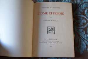 Maurras (Charles) - Ironie et poésie au Pigeonnier, Saint-Félicien-en-Vivarais, 1923. In-8 demi maroquin à coins, couv., conservée, tête dorée, 31 pp. frontispice et ornements gravés sur bois par Léon SCHULZ. Un des ex. sur papier Montgolfier...