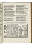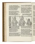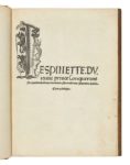 [Simon BOUGOUINC]. Lespinette du ieune prince Conquerant Le royaulme de bonne renommee Nouvellement Imprime a Paris. Cum privilegio. In-folio, maroquin citron, grand décor à entrelacs mosaïqués de veau noir de style Renaissance, dos à 5 nerfs orné de même, doublure de maroquin vert prairie avec large dentelle aux petits fers et ex-libris armorié de la bibliothèque de Mello au centre, doubles gardes, tranches dorées sur marbrure ( Niedrée-1844). Bechtel, 96/B-355 // Brunet, II-1062 // Cioranescu, 4534 // Fairfax Murray, 61 // Macfarlane, 90 // Tchemerzine-Scheler, II-437 // USTC, 8325. (124f.) / a-v6, x4 / 43 lignes sur 2 colonnes, car. goth. / 190 x 269 mm. Édition originale fort rare d’un dialogue composé de près de 20.000 vers, la plupart de dix syllabes. L’auteur, Simon Bougouinc ou Bougoinc, poète et prosateur français du XVIe siècle, fut valet de chambre du roi Louis XII. Il traduisit plusieurs traités de Lucien, composa des pièces de théâtre et cette poésie allégorique qu’il signa au dernier feuillet par un acrostiche intitulé Le nom de l’auteur en manière de supplication où les premières lettres se lisent verticalement Symon Bougouync. Le poème conte la rencontre de l’auteur avec un jeune prince pris par le mal d’amour. S’ensuit un long parcours semé d’aventures au cours desquelles sont abordés de multiples sujets dont l’amour et la vertu bien sûr, mais également des conseils de vie et d’éducation. Ils se rendent au chevet du père du prince qui, mourant, donne des conseils à son fils sur la société et la répartition des pouvoirs entre la noblesse, le clergé et les laboureurs (travailleurs). Puis leurs pas les mènent au Verger du monde où ils rencontrent la jeunesse et la folie avant de s’embarquer sur un navire, passent la mer périlleuse où est le lieu du salut et trouvent sur le bord de la mer un ermite nommé le père des vertus et un page nommé bonne compagnie. Sans entrer dans les détails, l’aventure continue plus loin avec la conquête de la ville de noblesse par le prince et le duc de brave amour, le couronnement du prince qui devient roi du royaume de bonne renommée et le couronnement de la reine nommée la dame de bon gouvernement ou Raison. L’ouvrage est abondamment illustré de gravures sur bois dont le titre avec une grande grotesque, 45 figures dans le texte, dont 15 prennent la largeur de la page et 30 plus petites, de nombreuses lettrines et la marque de l’imprimeur au dernier feuillet. Superbe exemplaire finement relié par Niedrée, relieur parisien qui obtint en 1844 une médaille d’argent le récompensant pour des reliures dans le style de la Renaissance… (d’) une telle exactitude de dessin… (qu’elles) surpassent les plus riches reliures des superbes bibliothèques de Henri II, du cardinal deFarnerie, de Henri III, de Grolier et de Thou. Petits frottements à une charnière et à 2 endroits du dos avec épidermures, une tache au second plat. 2 feuillets (f2-f5) plus courts dans la marge inférieure de 7 mm. Provenance: Armand Bertin (ex-libris, absent de la vente de 1854), baron Achille Seillière (supra-libris, II, 5-14 mai 1890, n° 449) et Fairfax Murray (étiquette, n° 61).