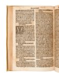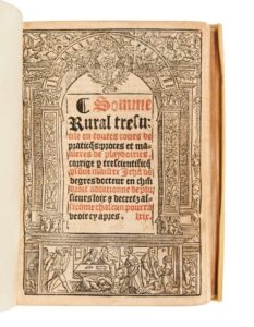 [Jehan BOUTILLIER]. Somme Rural tresutile en toutes cours de praticqs : proces et manieres de playdoiries. Corrige p[ar] trescientificq psõne maistre Jehã ds degres docteur en chm droit additionne de plusieurs loix & decretz aisicõme chascun pourra veoir cy apres. LXIX. In-8, vélin à recouvrements, dos lisse avec le titre calligraphié à l’encre ( Reliure moderne). Bechtel, 99/B-372 // Brunet, I-1187 // Renouard, ICP, III-1149. (300f. avec pagination fantaisiste) / a6, e4, i4, a-f4, g8, h-r4, s8, t-z4, ク4, A8, B-I4, K-L6, M-Q4, R8, S-V4, AA-VV4, AAA4, BBB6 / 40 lignes sur 2 colonnes, car. goth. / 126 x 182 mm. Rare édition de cet ouvrage de jurisprudence, sorte de code des usages […] d’une partie du nord de la France et de la Flandre (Tournoisis, Vermandois, Hainaut), voire au-delà (Bechtel). L’auteur, célèbre jurisconsulte français de la seconde moitié du XIVe siècle, fut d’abord bailli à Mortagne puis conseiller pensionnaire à Tournay, sorte de fonctionnaire chargé de rapporter toutes les affaires litigieuses et d’en faire des extraits. Leur connaissance des lois et du droit donnait une haute autorité à leur parole. Il devint ensuite lieutenant du grand bailli à Tournay. Le rôle que joua Jean Boutillier dans les diverses magistratures fut d’asseoir le pouvoir judiciaire royal au détriment du droit des seigneurs et de celui de l’église. Sa Somme rurale, un des premiers ouvrages de notre jurisprudence, est l’un des plus importants selon Cujas qui l’avait qualifié d’ Optimus liber. Le mot rural ne signifie pas ici que l’ouvrage traite du droit rural mais qu’il fut composé à la campagne. Il traite de multiples sujets et problèmes fondés sur des décisions de justice tant civiles que pénales. La Somme rurale fut publiée pour la première fois en 1479 à Bruges et connut de très nombreuses éditions en français et en flamand. Celle que nous présentons est datée par Brunet vers 1525, mais Renouard dans l’ Inventaire chronologique des éditions parisiennes du XVIe siècle la situe un peu plus tard, vers 1527, d’après la marque et l’encadrement. Titre en rouge et noir dans un bel encadrement gravé sur bois de type architectural avec dans la partie inférieure une curieuse vignette à plusieurs personnages représentant, probablement, un voleur puni de décapitation avec les différents acteurs de ce drame. Le chiffre romain LXIX sur le titre correspond au nombre de cahiers qu’il faut au volume. Marque de l’imprimeur à un feuillet (I4) et un feuillet (P1) plus large que les autres, replié, avec au verso un grand bois représentant l’ arbre de consanguinité qui indique les impossibilités d’union entre parents. On trouve le schéma du même arbre au feuillet P4 et le volume contient également plusieurs lettrines à motifs foliacés. Inversion de feuillets au cahier L, feuillets brunis, trou au feuillet M4 avec pertes de quelques lettres.