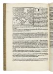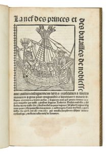 Symphorien CHAMPIER et Robert de BALSAT. La nef des princes et des batailles de noblesse avec aultres enseignemens utilz & profitables a toutes manieres de gens pour congnoistre a bienvivre & mourir dediques et envoyes a divers prelas ク seigneurs… In-folio, maroquin vert sapin, plats ornés dans le genre Du Seuil, dos à 6 nerfs finement orné aux petits fers, dentelle intérieure, tranches dorées sur marbrure ( Bauzonnet-Trautz). Baudrier, XII-56 // Bechtel, 49/B-17 // Brunet, I-1769 // Fairfax Murray, 83 // USTC, 11002. 66f. (mal chiffrés LXV) / a-l6 / 40 ou 41 longues lignes parfois sur 2 colonnes, car. goth. / 159 x 240 mm. Première et rare édition de l’un des livres les plus curieux de Champier, publié à Lyon en 1502. Symphorien Champier, célèbre médecin et historien français, est né en 1471 (1472?) à Saint-Symphorien-le-Loise et mort vers 1540. Ayant fait ses humanités à Paris, il s’adonna à l’étude des Belles-Lettres puis de la médecine et fut reçu docteur à l’âge de vingt ans. Il exerça son art à Lyon et produisit dans le même temps, en 1503, un ouvrage, La Nef des dames vertueuses qui lui valut l’admiration de ses contemporaines qui se précipitaient en foule sur son passage. Il épousa une cousine de Bayard, Marguerite Du Terrail puis, en 1509, suivit comme médecin le duc Antoine de Lorraine qui s’en allait rejoindre Louis XII parti conquérir le Milanais. Il se signala à la bataille d’Agnedel, suivit son protecteur à Nancy, repassa les Alpes, se distingua à la bataille de Marignan où il fut créé chevalier de Saint-Georges aux éperons d’or. Revenu en France, il se fixa à Lyon où il exerça la médecine, rédigea des ouvrages de belles lettres, s’occupa des affaires municipales de la ville où il créa le collège de la Trinité, fonda le collège de médecine, etc. Les noms des deux auteurs sont indiqués dans le titre et l’ouvrage est souvent référencé à Balsat, premier nommé audit titre, mais nous avons préféré en donner la paternité à Symphorien Champier, Balsat n’ayant rédigé ici que la Nef des batailles qui occupe les feuillets 54 à 63 et Champier étant l’auteur du reste du volume. La Nef des Princes est, selon Potier (in Catalogue J. Renard, n° 269), une espèce de macédoine entremêlée de français et de latin où l’on trouve de tout, moralités, joyeusetés et beaucoup d’érudition… On y trouve, entre autres, le Testament de ung vieil prince, le Doctrinal des princes, La Fleur des princes, le Dyalogue de noblesse, la Declaracion du ciel et du monde et des merveilles de la terre, la Malice des femmes, le Doctrinal du père de famille, les Enseignemens utiles a tous les peres de famille, le Regime d’ung serviteur, etc. C’est, ainsi que l’écrit Bechtel, mises bout à bout, toutes les connaissances nécessaires à la fonction de prince, mais l’ouvrage, comme on le devine, dépasse largement ce cadre. L’ouvrage est abondamment illustré de bois gravés de différentes tailles et sur les sujets les plus divers et les plus curieux. Au total, 42 bois gravés dont 7 répétés. On remarquera plus spécialement le titre avec une nef à bord de laquelle se trouvent un roi, une reine, un prince et un autre roi tenant une lyre (David?), et une curieuse représentation du monde avec les noms des pays placés sur un grand disque. Fairfax Murray et Potier, via la notice du catalogue Ruble (n° 83), font remarquer que quatre gravures sur métal, dites interrasiles ou à la manière éraillée qui avaient été employées par Numeister pour deux éditions qu’il a données des Méditations de Turrecremata, ont été à nouveau utilisées ici (f. XIX, XXV, XXX marqué XXXIII et LIII). Très bel exemplaire malgré 2 minimes éraflures au second plat et une tache au titre. Provenance: Baron Joseph de Ruble (ex-libris, 28 mai-3 juin 1899, n° 83) et Fairfax Murray (étiquette, n° 83).