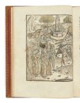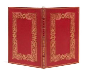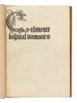 Alain CHARTIER [Achille CAULIER]. Cy cõmence lospital damours. Plaquette in-8, maroquin rouge, triple filet en bordure des plats et large encadrement droit formé de deux doubles filets s’entrecroisant dans les milieux, les champs entre eux ornés aux petits fers de filets, fleurs, cercles, points…, dos à 5 nerfs finement orné aux petits fers, dentelle intérieure, tranches dorées ( Thibaron - Dor. Wampflug). Bechtel, 369/H-58 // Brunet, III-345 // CIBN, I-C-282 // Tchemerzine-Scheler, II-276. (34f.) / a-c8, d10 / 20 à 22 lignes, car. goth. / 130 x 189 mm. Seconde édition et première en caractères gothiques de ce poème attribué par les bibliographies anciennes à Alain Chartier, parce que publiée dans ses œuvres, et aujourd’hui référencée sous le nom de son véritable auteur, Achille Caulier, prêtre originaire de Tournai à qui l’on doit deux autres œuvres, La Cruelle femme en amour et Lay en l’onneur de la Vierge Marie. L’Hôpital d’amour est une sorte de réponse à La Belle dame sans mercy d’Alain Chartier. Le poète tombe amoureux d’une dame qui se montre inflexible à son amour. Il rentre chez lui et, en songe, il parcourt le chemin de trop-dure-responce, semé d’embûches et de cadavres dans lesquels il reconnaît des amants malheureux, Philis, Héro et Léandre, Narcisse, Pyrame et Thisbé…, puis arrive à l’hôpital d’amours où il est accueilli par la portière Bel Accueil, l’infirmière Courtoisie, etc. qui lui font prendre une drogue. Il revient alors vers sa dame et obtient ung franc baiser. Il visite ensuite le cimetière d’Amours, y reconnaît les tombes de Tristan, Lancelot… et même d’Alain Chartier… puis, après quelques autres péripéties, obtient de sa dame un autre baiser et s’éveille. L’attribution à Alain Chartier est d’autant plus contestable que le poète dit l’avoir rencontré mort dans le cimetière d’amours. Le nom du véritable auteur se devine dans l’acrostiche des premiers vers des 6 premières strophes formant le nom ACILLE. L’édition originale fut publiée à Lyon entre 1489 et 1492. Elle fut suivie par l’édition que nous présentons qui fut publiée dans la même ville chez Gaspar Ortuin vers 1490, datation faite d’après l’usure des caractères. Une grande lettrine au titre et un curieux bois au verso représentant Cupidon, les yeux bandés, dardant ses flèches vers une foule d’hommes et de femmes de toutes conditions, au fond Pyrame, Thisbé et la lionne sont embrochés sur une pique. Superbe exemplaire dans une fine reliure de Thibaron dorée par Wampflug qui travailla avec Lortic avant de s’établir à son compte en 1855. Un choc à la coupe supérieure du second plat. Gravure sur bois en partie coloriée anciennement et en partie effacée. Provenance: Léon Cailhava(21 octobre 1845, n° 303), Nicolas Yemeniz(n° 1626) en maroquin citron, puis Étienne-Marie Bancel dans sa reliure actuelle (ex-libris, 8 mai 1882, n° 240).
