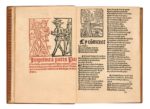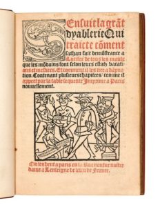 [Eloy DAMERVAL]. Sensuit la grãt dyablerie Qui traicte cõment sathan fait demõstrance a Lucifer de tous les maulx que les mõdains font selon leurs estatz vacations et mestiers. Et comment il les tire a dpnation… Petit in-4, maroquin janséniste rouge, dos à 5 nerfs, roulette et filets intérieurs, tranches dorées sur marbrure ( Chambolle-Duru). Bechtel, 204/D-26 // Brunet, II-478 // Fairfax Murray, 600 // Tchemerzine-Scheler, II-720 // USTC, 83461. (150f.) / A6, b-e4-8, f4, g-o4-8, p4, q-z4-8, ク4, A4, B8 / 40 lignes sur 2 colonnes, car. goth. / 130 x 190 mm. Très rare seconde ou troisième édition de ce poème théologique faisant le tour des vices humains, une édition contemporaine de celle-ci ayant également été publiée chez Le Noir. On sait peu de choses d’Eloy Damerval, dont on apprend qu’il est l’auteur de ce texte par la table de la première édition. Chantre à la Cour de Savoie, puis attaché à Charles d’Orléans au château de Blois, il était, en 1483, maître des enfants de chœur de Sainte-Croix à Orléans. La Grande diablerie est son œuvre la plus célèbre. Composé d’un prologue en 8 chapitres et de deux livres en 260 chapitres que suit la conclusion finale de l’acteur, ce dialogue comique entre Satan et Lucifer compte plus de 22.000 vers. Satan, plein d’expérience, y expose à un jeune Lucifer naïf les travers et les faiblesses des hommes et des femmes et les moyens de les tenter: Jay mille millions de trappes Et de trebuchetz Lucifer Pour les faire cheoir en enfer Le monde la chair et les dyables Nuyt et jour ce ne sont pas fables. L’intention de Damerval est de défier les hommes de tomber en ces pièges, mais il ne se défend pas, se réclamant d’Esope, d’une certaine prétention littéraire, Come Esopes en ung beau mettre / Se dit bien qui est panthamettre: Et ne se faut esmerveiller Si jay voulu pour resveiller Les entendemens des lisans Oser souvent des motz plaisans Et de termes assez joyeulx Affin destre mains ennuyeulx Car les rimes entrelardees Des motz joyeulx sont regardees Comunement plus voulentiers… On notera d’ailleurs, dans le chapitre 68, une mention de François Villon qui est probablement l’une des plus anciennes références littéraires au poète: Maistre Francoys Villon jadis / Clerc expert en faictz et en ditz / Comme fort nouveau quil estoit / Et a farcer se delectoit / Fist a Paris son testament. Cette œuvre a paru pour la première fois chez Michel Le Noir vers 1508. C’est de la table de cette première édition que l’on tire le nom de l’auteur: De maistre Eloy d’Amerval (…) / Cy s’ensuyt (…) la Dyablerie… Ces vers ne sont pas repris dans notre édition qui mentionne uniquement le prénom de l’auteur au début du prologue et à la toute fin du volume: Prier aussi le createur / Pour moy Eloy le pauvre acteur. Titre en rouge et noir orné d’une grande lettrine et d’un grand bois représentant cinq diables dont l’un prend de longues notes, un grand bois au colophon (f.A6v) imprimé en rouge et noir représentant 6 diables, et un bois plus petit en noir montrant Dieu apparaissant à l’auteur (f. b1r). Les feuillets A2v et A5r sont imprimés en rouge et noir, 47 petites lettrines à fond criblé. L’édition est extrêmement rare. On en recense quatre ou cinq exemplaires: un à la Bibliothèque Mazarine, un à la Kongelige Bibliotek de Copenhague, l’exemplaire Soleinne, l’exemplaire Yemeniz (n° 1702)/Firmin-Didot (n° 174) et celui-ci. Les exemplaires Soleinne et Yemeniz/Firmin-Didot, tous deux reliés en veau ancien, sont peut-être les mêmes. Bel exemplaire malgré un petit manque en haut d’un mors et léger choc à une coupe du premier plat. Cahiers v et x inversés, une annotation ancienne à l’encre (f. B7v), restauration angulaire à 4 feuillets (A1, c1, y4 et ク1) et restauration avec atteinte à quelques lettres (f. l2). Provenance: Fairfax Murray (étiquette, n° 600).