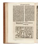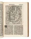 [Perrinet DU PIN]. La conqueste de Grece Faicte par le trespreux & redoubte en chevalerie Philippe de madien Aultremēt dit le chevalier a lesparvier blãc Hystoire moult recreative et delectable. Nouvellement Imprime a Paris. Petit in-folio, maroquin rouge, triple filet à froid, dos à nerfs orné de même, dentelle intérieure, tranches dorées sur témoins ( Noulhac). Bechtel, 603/P-126 // Brunet, II-226 // USTC, 55596. (4f.)-CXIIII / +4, A-T6 / 43 lignes sur 2 colonnes, car. goth. / 178 x 247 mm. Édition originale très rare de ce roman de chevalerie qui eut également une autre édition non datée chez Jehan Bonfons qui officia dans la seconde moitié du XVIe siècle. On sait très peu de choses sur son auteur. Né à La Rochelle dans la première moitié du XVe siècle, Perrinet Dupin ou Du Pin a vraisemblablement séjourné à la Cour de Savoie entre 1458 et 1482. Il fut nommé par la duchesse Yolande secrétaire ducal dans les années 1470, avec sans doute la mission de rédiger une histoire des comtes et du premier duc de Savoie. Il a laissé de cette époque une Chronique du Comte rouge qui relate l’histoire d’Amédée VII, comte de Savoie. Avant cette période savoyarde, Perrinet Du Pin avait composé, en 1448, ce roman de chevalerie intitulé La Conqueste de Grece faicte par le trespreux et redoubte en chevalerie Philippe de Madien, qu’il avait dédié à la duchesse de Lusignan, épouse du duc Louis. Il est illustré d’un très beau bois gravé sur le titre représentant le chevalier Philippe de Madien en armure, sur un cheval caparaçonné, partant à la conquête de la Grèce, des armes de France au verso du titre, d’un bois représentant l’auteur à son pupitre, de 8 bois dans le texte illustrant le roman et de la marque de l’imprimeur au dernier feuillet. Superbe exemplaire de ce très rare roman de chevalerie dont nous n’avons pas trouvé d’exemplaires dans les collections privées classiques, sauf un chez Firmin-Didot cité par Bechtel. Minimes piqûres aux 2 premiers feuillets et quelques pâles auréoles anciennes.