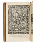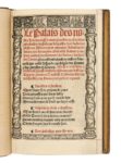 Jehan DU PRÉ. Le Palais des nobles Dames auql a treze parcelles ou chambres principales : en chascune desquelles sont declarees plusieurs histoires tant grecques hebraicques latines que francoyses. Ensemble fictions & couleurs poeticques cõcernans les Vertus et louãges des Dames. In-8, maroquin rouge, triple filet, dos à 5 nerfs joliment orné, doublure du même maroquin avec filets, roulettes et écoinçons aux petits fers, doubles gardes, tranches dorées sur marbrure ( Chambolle Duru). Bechtel, 251/D-431 // Brunet, II-899 // Rothschild, IV-2862 // USTC, 29407. (128f.) / a-o8, p6, q10 / 28 lignes, car. goth. / 120 x 182 mm. Édition originale de ce poème destiné à la réhabilitation de l’honneur féminin. On sait peu de choses sur Jehan Du Pré. Gentilhomme du Quercy, il assista, en qualité d’homme d’armes du grand écuyer de Genouillac, à la bataille de Pavie qui vit la défaite de la France et François Ier fait prisonnier, ce qui déboucha sur le traité de Madrid et la perte d’un quart de la France. Du Pré fut blessé et dépouillé à Pavie et, comme il l’écrivit dans un poème qu’il adressa à la reine Marguerite de Navarre, il ne dut son secours qu’à Louise de Savoie, mère de François Ier: Tant dommageable que suit devant Pavie Sans son secours ie ne tiendroys pas vie Car lors estant deffaict et indigent Suiz refreschi d’une somme d’argent Dans son poème Palais des nobles dames, Jehan Du Pré déplore la mort de cette princesse qui décéda en 1531, ce qui nous indique qu’il fut rédigé après cette date. L’auteur utilise le même artifice que celui employé par Gratien Du Pont dans ses Controverses des sexes masculin et féminin lorsque ce dernier voulut dénigrer la cause féminine, mais dans un but opposé car Du Pré écrit ici son ouvrage à la gloire des femmes. C’est pendant un songe qu’il rencontre Noblesse féminine. Elle le conduit dans son palais dont il visite les treize pièces et où il rencontre successivement les femmes ou déesses qui se sont illustrées par leur science, leur chasteté, leur fidélité, leur fécondité… L’ouvrage se termine par une pièce poétique intitulée: Dialogue nõ moīs utile que delectable: Auquel sont introduitz les dieux Jupiter et Cupido disputans de leurs puissances: et par fin ung Antidote et remede pour obvier aux dangiers amoureux., signée d’Hugues Salel. Plusieurs des pièces de la première partie sont suivies de la signature Lelas et certains comme Lachèvre ont cru reconnaître en Hugues Salel le véritable auteur du Palais des nobles Dames. Nous préférons pour notre part l’opinion exprimée dans le catalogue Rothschild qui voit dans Hugues Salel l’imprimeur du Palais des nobles Dames. Titre en rouge et noir, grand bois au verso représentant Noblesse féminine accueillant l’auteur devant son palais, un grand bois répété montrant le jardin du palais et 12 petits bois figurant des femmes célèbres. La seconde partie contient un encadrement de titre formé de petits bois juxtaposés, un grand bois représentant Hugues Salel qui va être frappé d’une flèche par Cupidon et une grande lettrine historiée. Ces bois sont grossièrement exécutés mais d’un grand et beau caractère de dessin (Viollet-Le-Duc). Petit frottement en haut d’un mors. Feuillets a1, a2, q2 à q10 restaurés et en partie réemmargés. Très bel exemplaire réglé à l’encre rouge dans une fine reliure doublée de Chambolle-Duru. Provenance: Édouard Rahir (II, 6-8 mai 1931, n° 496).