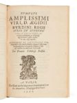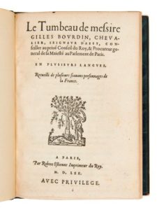 [François d’AMBOISE]. Le Tumbeau de Messire Gilles Bourdin, chevalier, seigneur d’Assy… en plusieurs langues Recueilli de plusieurs scavans personnages de la France. – François d’AMBOISE. Tumulus amplissimi viri. Le Tombeau de… Gilles Bourdin. Paris, Denis du Pré, 1570. Ensemble 2 plaquettes en un volume in-4, chagrin janséniste bleu nuit, dos lisse ( Reliure moderne). Brunet, Supplément I-36 // Lachèvre, 243 // Rothschild, 815. I. (12 f.) / A-C4// II. (6 f.) / A4, B2 / 143 x 205 mm. Édition originale de ces deux plaquettes publiées en hommage à Gilles Bourdin, conseiller au Conseil privé du Roi, procureur général au Parlement de Paris et érudit protecteur des lettres. Né en 1515, Gilles Bourdin fut avocat général avant d’être nommé procureur général du Roi. En véritable humaniste, il connaît le latin, le grec et l’hébreu et donna dans ces diverses langues un commentaire sur Aristophane et des paraphrases sur des édits. Sa mort en 1570 suscita l’hommage de nombreux écrivains. On trouve dans son Tombeau vingt-quatre pièces par dix-sept auteurs, en vers français, latins, grecs et hébreux, par Dorat, Pasquier, Baïf, Jodelle, Belleforest, Desportes, Thevet, etc. François d’Amboise (1550-1619), lui-même magistrat et poète, fut particulièrement proche de Gilles Bourdin et composa à lui seul un Tombeau en latin et en français. Petits frottements. Fine mouillure en pied des deux premiers cahiers.