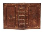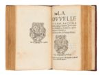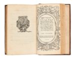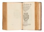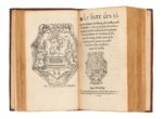 Michel d’AMBOISE. Le Secret d’Amours ou sont contenues plusieurs lettres tant en rithme qu’en prose, fort recreative a tous Amans… – [François HABERT]. Le Livre des visions fantastiques du Banny de lyesse, natif d’Yssouldun en Berry, ou sont contenues les amours infortunées de deux amans… Paris, Les Angeliers, 1542.– François HABERT. La Nouvelle Venus, par laquelle est entendue pudique Amour… Paris, L’Angelier, s. d. (1547) – Janus OLIVIER. La Pandore… Nouvellement traduicte… par Guillaume Michel de Tours. Paris, Les Angeliers, 1542. – Olivier de MAGNY. Hymne sur la naissance de Madame Marguerite de France… Paris, Les Angeliers, 1553. 5 ouvrages en un volume in-8, veau marron, décor dans le genre Du Seuil avec double encadrement de triples filets à froid et lys dorés aux angles, fleurons à froid au centre, dos à 5 nerfs orné de filets à froid et de fleurettes à froid et dorées ( Reliure de l’époque). Brunet, I-223 / III-3-4 / IV-181 // Quérard, II-455. I. (80 f.) / a-k8. II. LXXIX f.-(1 f.) / A-K8. III. (28 f.) / A-G4. IV. LXIII f.- (1 f.) / A-H8. V. (34 f.) / a-h4-i2 / 100 x 163 mm. Rare réunion de cinq ouvrages de poésie publiés chez les frères Angelier entre 1542 et 1553. Édition originale du Secret d’amours de Michel d’Amboise, de La Nouvelle Venus de François Habert, de l’ Hymne sur la naissance de Madame Marguerite de France d’ Olivier de Magny, de la traduction de La Pandore de Janus Olivier et seconde édition du Livre des visions fantastiques de François Habert. Le Secret d’amours, donné par De Backer comme rarissime, contient des lettres galantes en prose et en vers, des rondeaux, ballades et épigrammes. Le Livre des visions fantastiques, contant les amours infortunées de deux amants, est suivi de diverses pièces poétiques de François Habert, une Oraison à Jésus Christ, une Églogue sur la mort d’Erasme, des discours divers… La Nouvelle Vénus est chaste et son amour est tout spirituel. La Pandore laisse supposer que les femmes sont la boîte de Pandore d’où sont sortis tous les maux de ce monde et enfin l’ouvrage d’Olivier de Magny s’entend lui-même par son titre. Les quatre premiers ouvrages portent la marque des Angeliers aux premiers et derniers feuillets et le cinquième volume offre un bel encadrement de titre architectural à enroulements. Bel exemplaire dans une séduisante reliure de l’époque. Reliure anciennement restaurée. Début de fente à une charnière et quelques taches sur les plats.