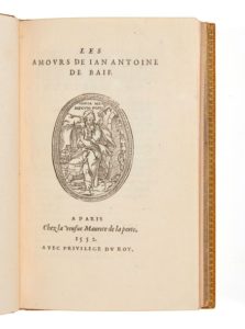 Jean-Antoine de BAÏF. Les Amours. In-8, maroquin citron, triple filet, dos à 5 nerfs joliment orné, dentelle intérieure, tranches dorées, étui ( Honnelaître). Brunet, I-612 // Tchemerzine-Scheler, I-239. 103 / a-f8, g4 / 100 x 161 mm. Édition originale rare. Fils naturel de Lazare de Baïf, Jean-Antoine de Baïf, né à venise en 1532, fit partie de la Pléïade réunie autour de Ronsard qui fut son condisciple chez Jean Dorat. Inventif, il explora la langue française, l’entremêlant de mots grecs, latins et de langues mortes, en tentant d’introduire dans la poésie française la cadence des vers antiques et une orthographe phonétique détachée de l’étymologie. Ses innovations, qui allèrent jusqu’à l’invention d’un nouvel alphabet, n’eurent pas le succès auquel il aspirait, mais ne furent pas inutiles aux progrès de la langue française à l’époque. Il fonda la première société littéraire de France en 1571 et mourut en 1589, laissant derrière lui de nombreux ouvrages (poèmes, passe-temps, jeux, tragédie, comédie, etc.). C’est âgé d’à peine vingt ans qu’il fait paraître ses Amours, deuxième ouvrage publié après Le Ravissement d’Europe, paru la même année chez le même éditeur. Auparavant, il avait donné quelques traductions ou publié quelques vers et distiques inclus dans des Odes de Ronsard (1550). Composé de deux livres réunissant des sonnets et chansons au mètre varié, ce recueil des Amours chante la passion du poète pour la belle Méline; il prendra par la suite le titre d’ Amours de Méline. Très bel exemplaire, lavé, et finement établi par Honnelaître. Restauration atteignant quelques lettres au feuillet G3.
